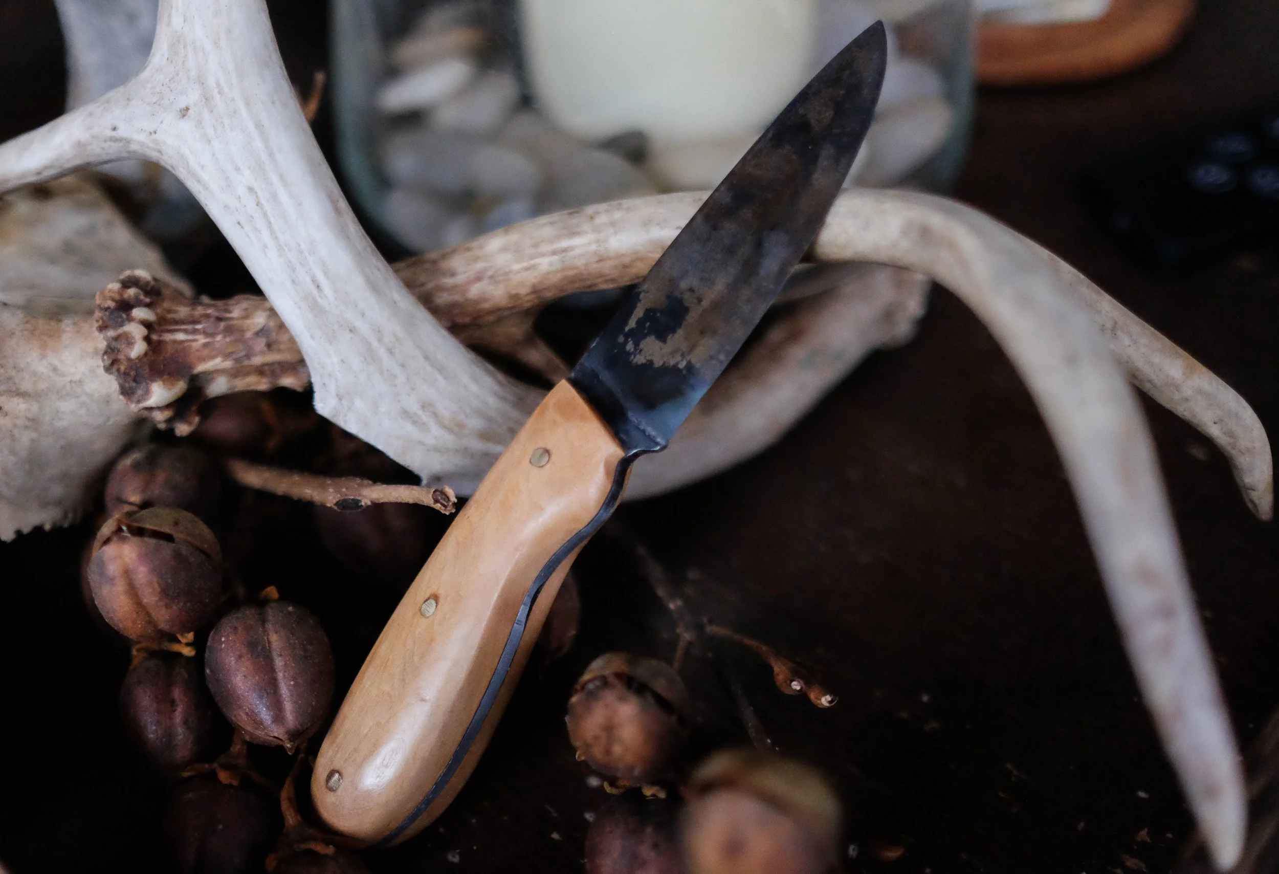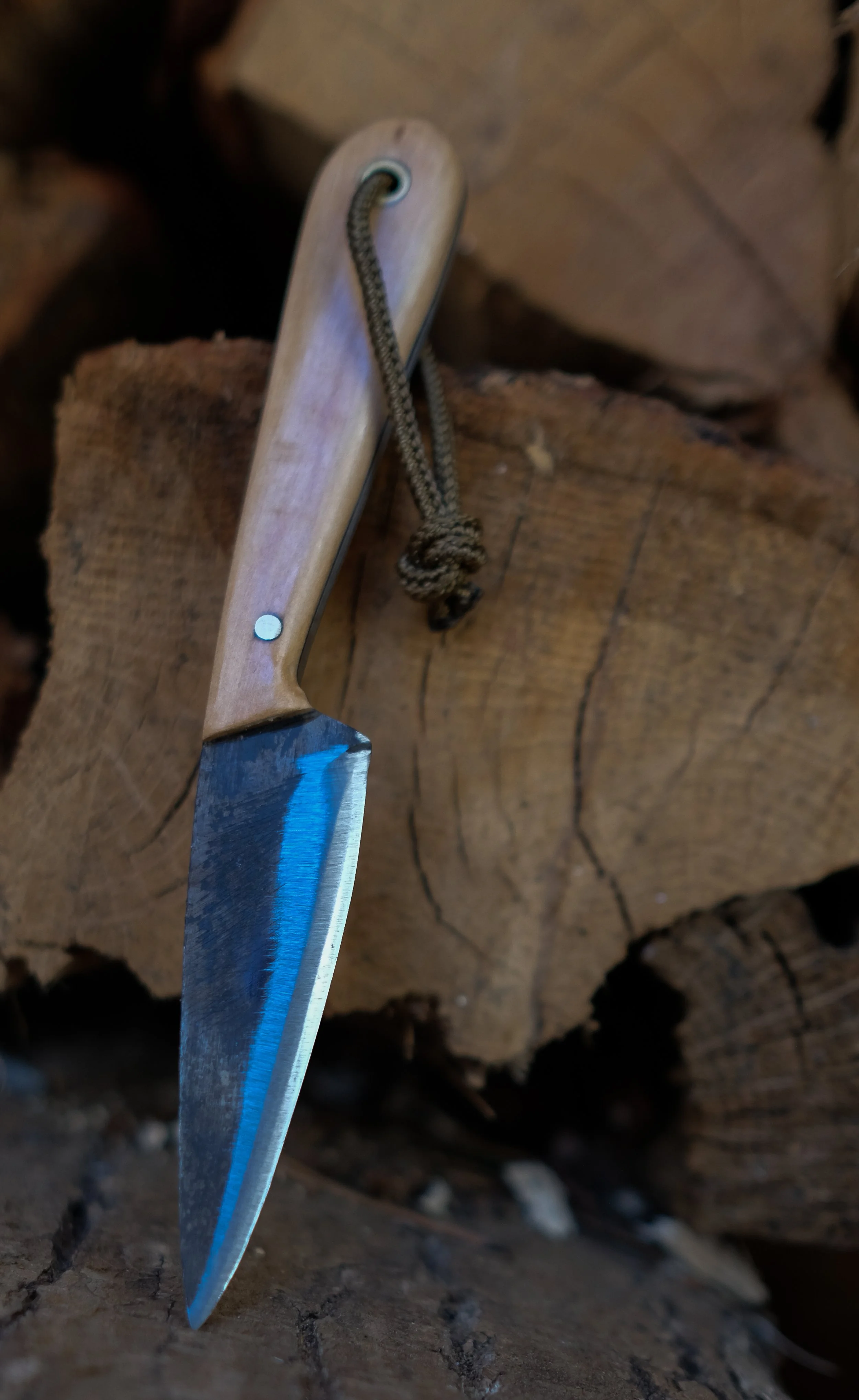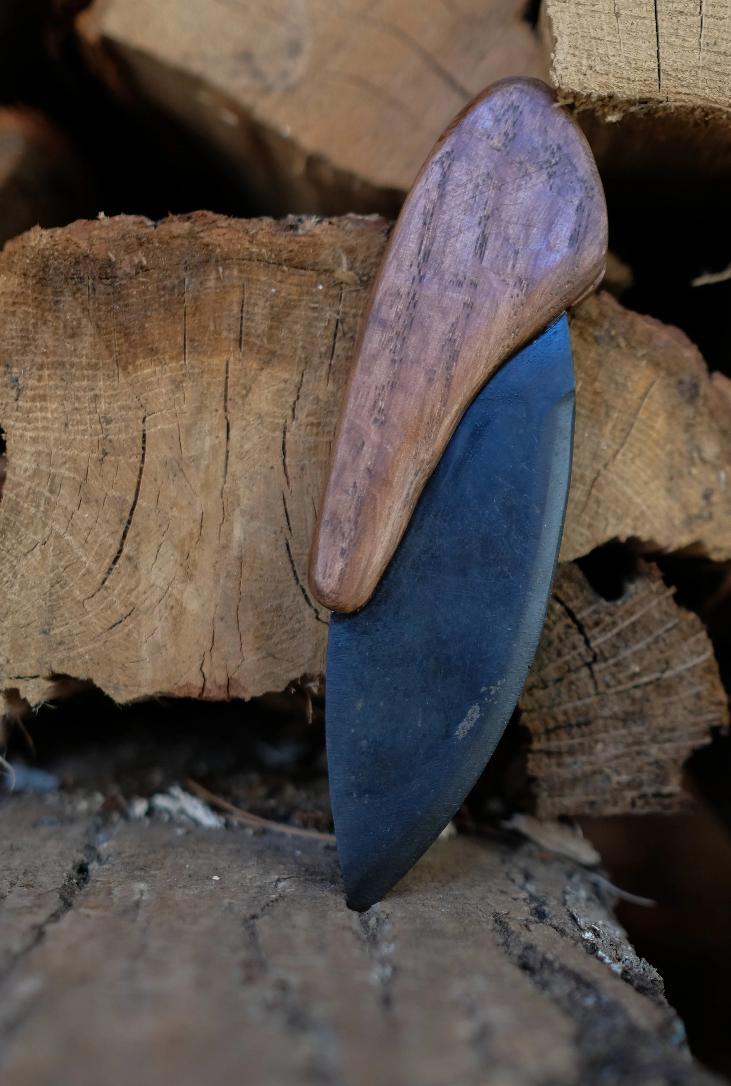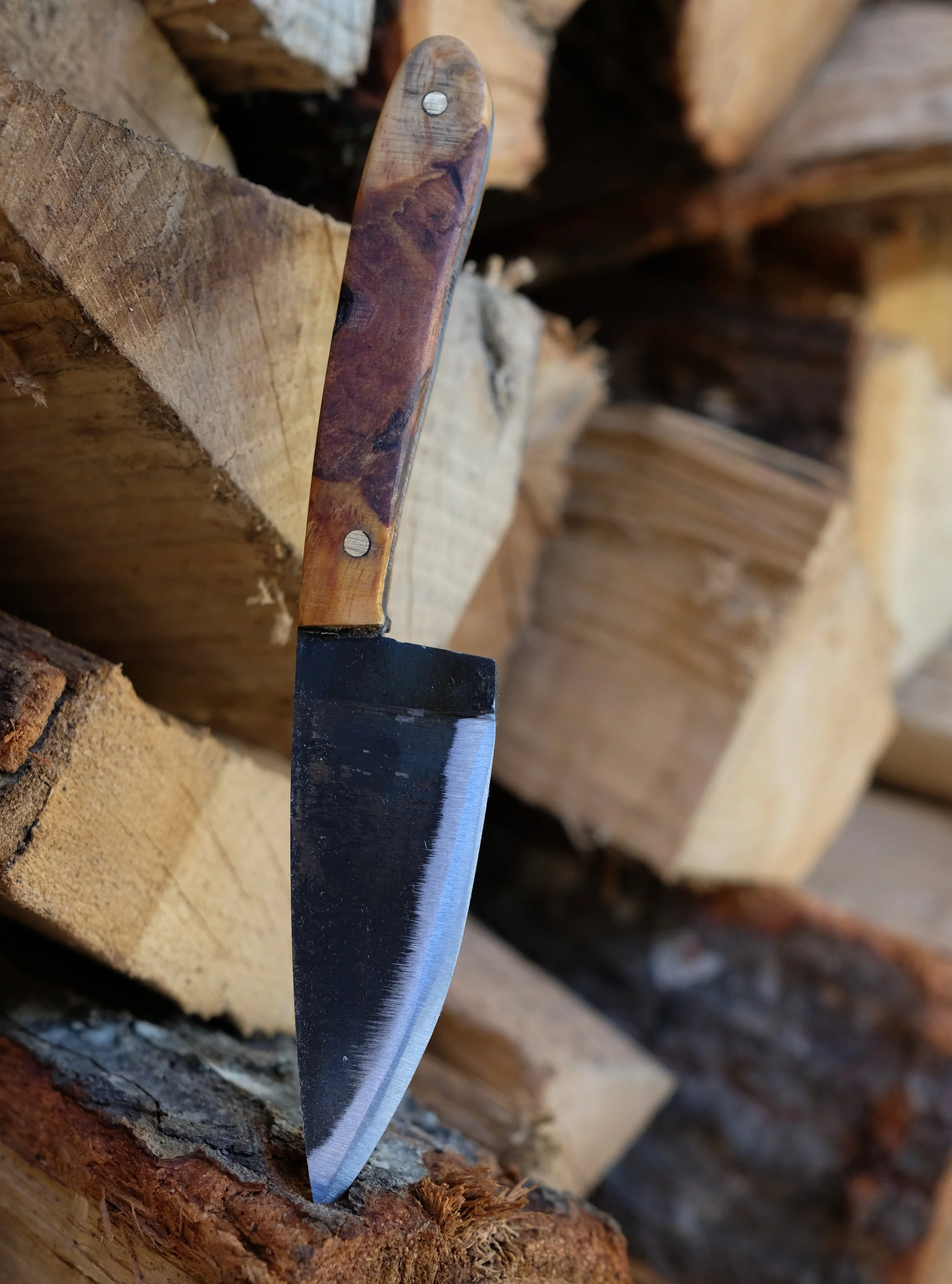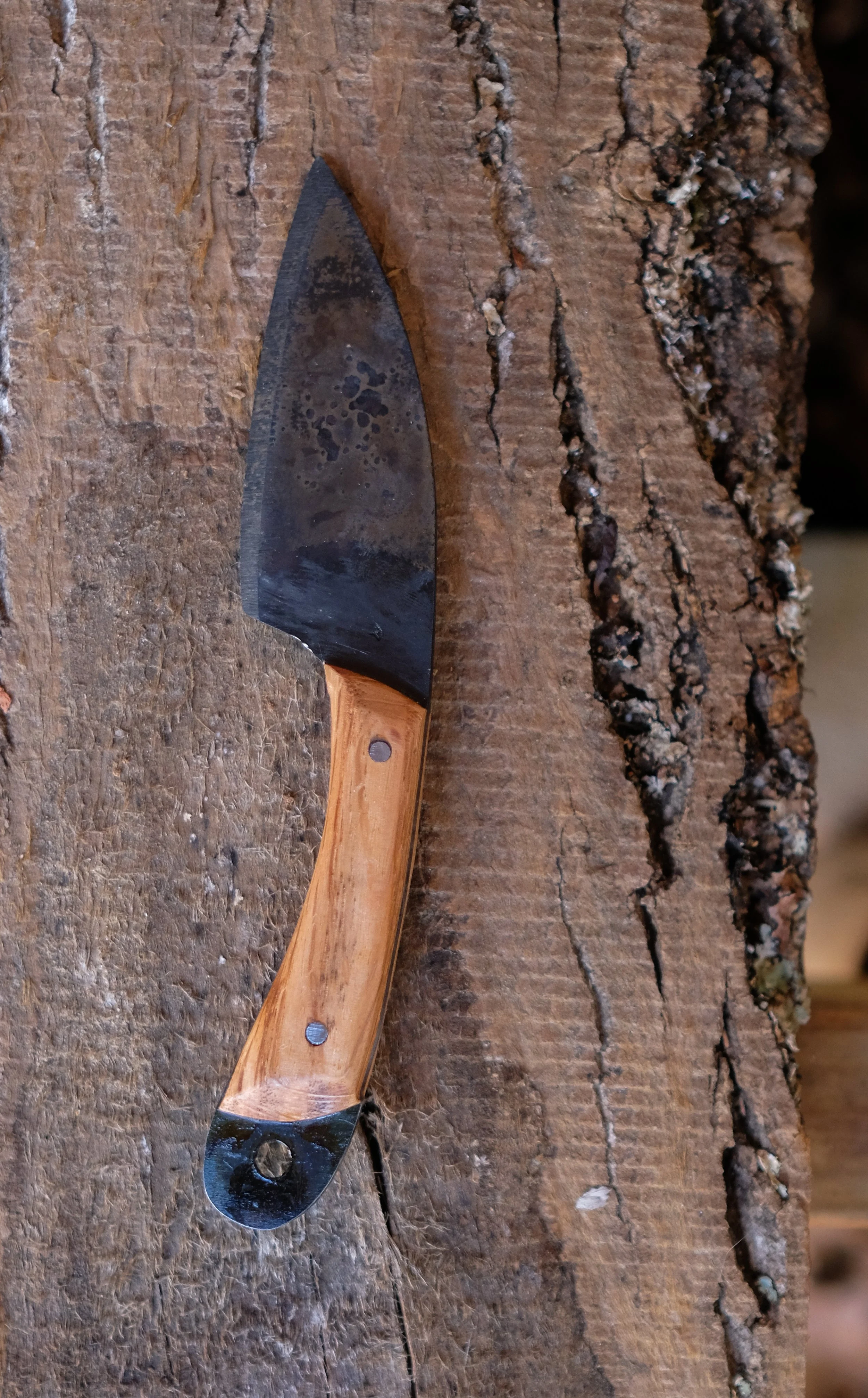 Rustic knives with native North American wood handles*. All knives are designed and cut from steel then drilled and forged to hardness. Wooden scales are shaped to fit each unique design, pinned, epoxied in place, and finished with several coats of Tung oil. Each knife comes with a novel sheath (see below). From kitchen utensils to a tool you can use in the field, these knives are created for purpose.