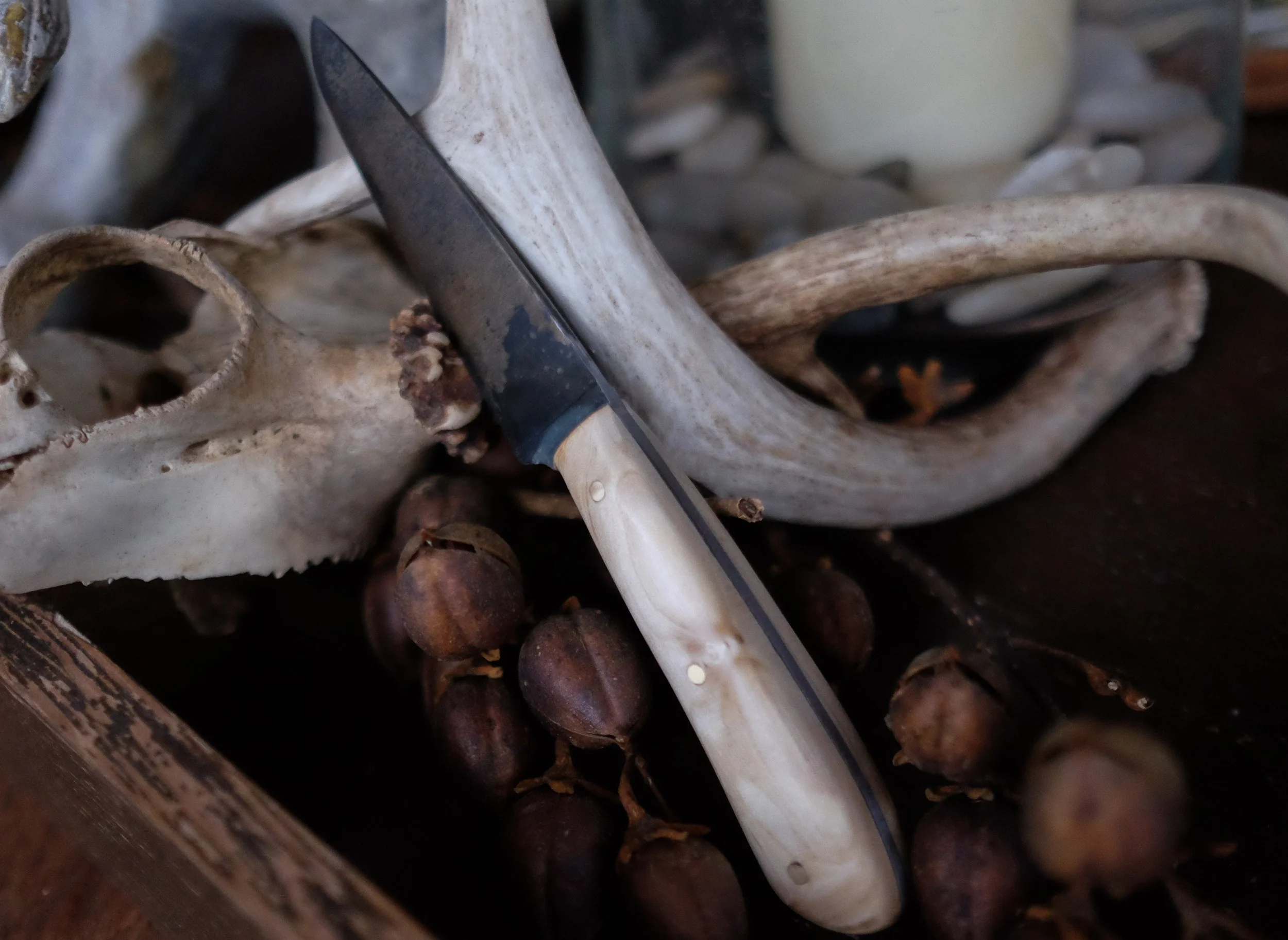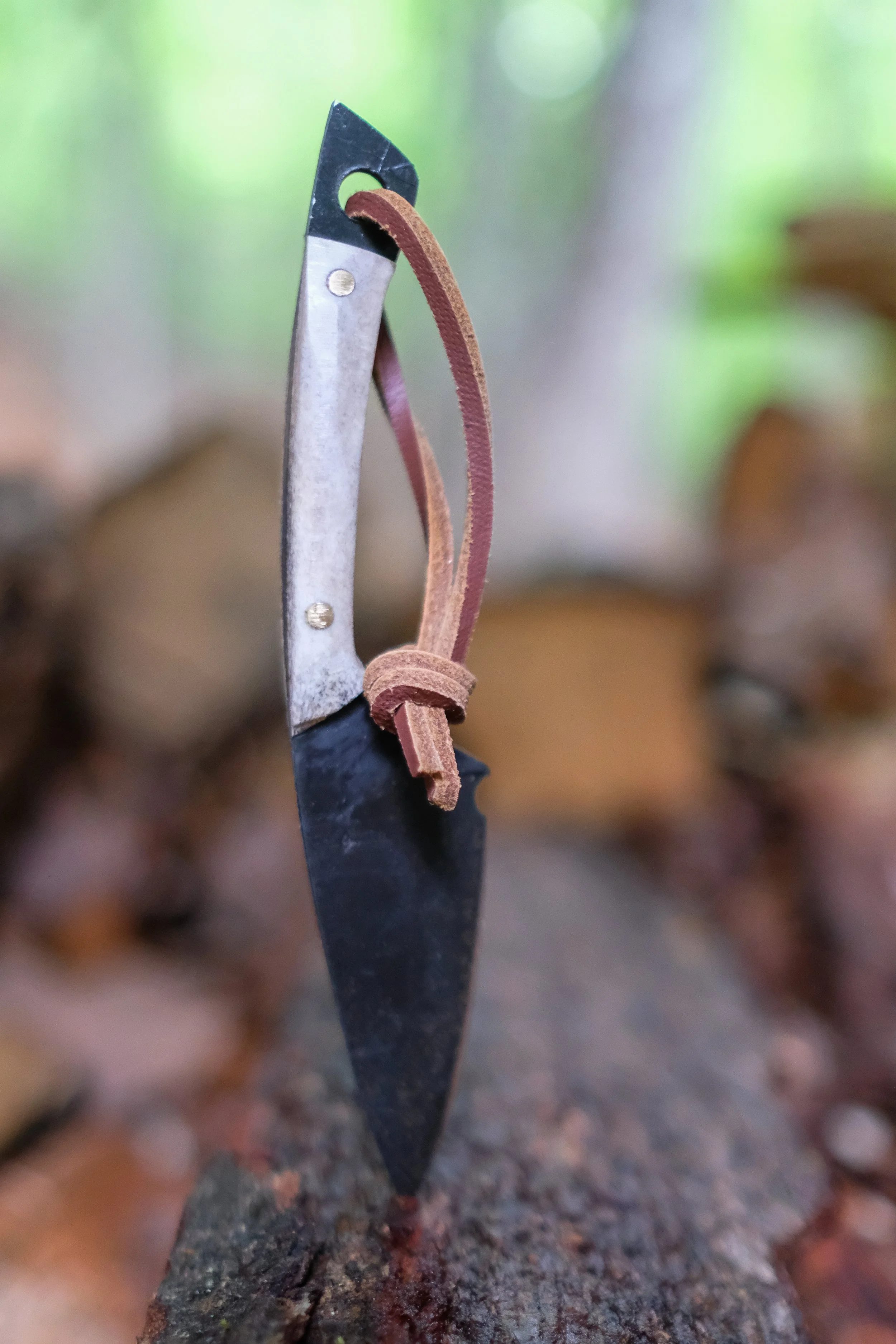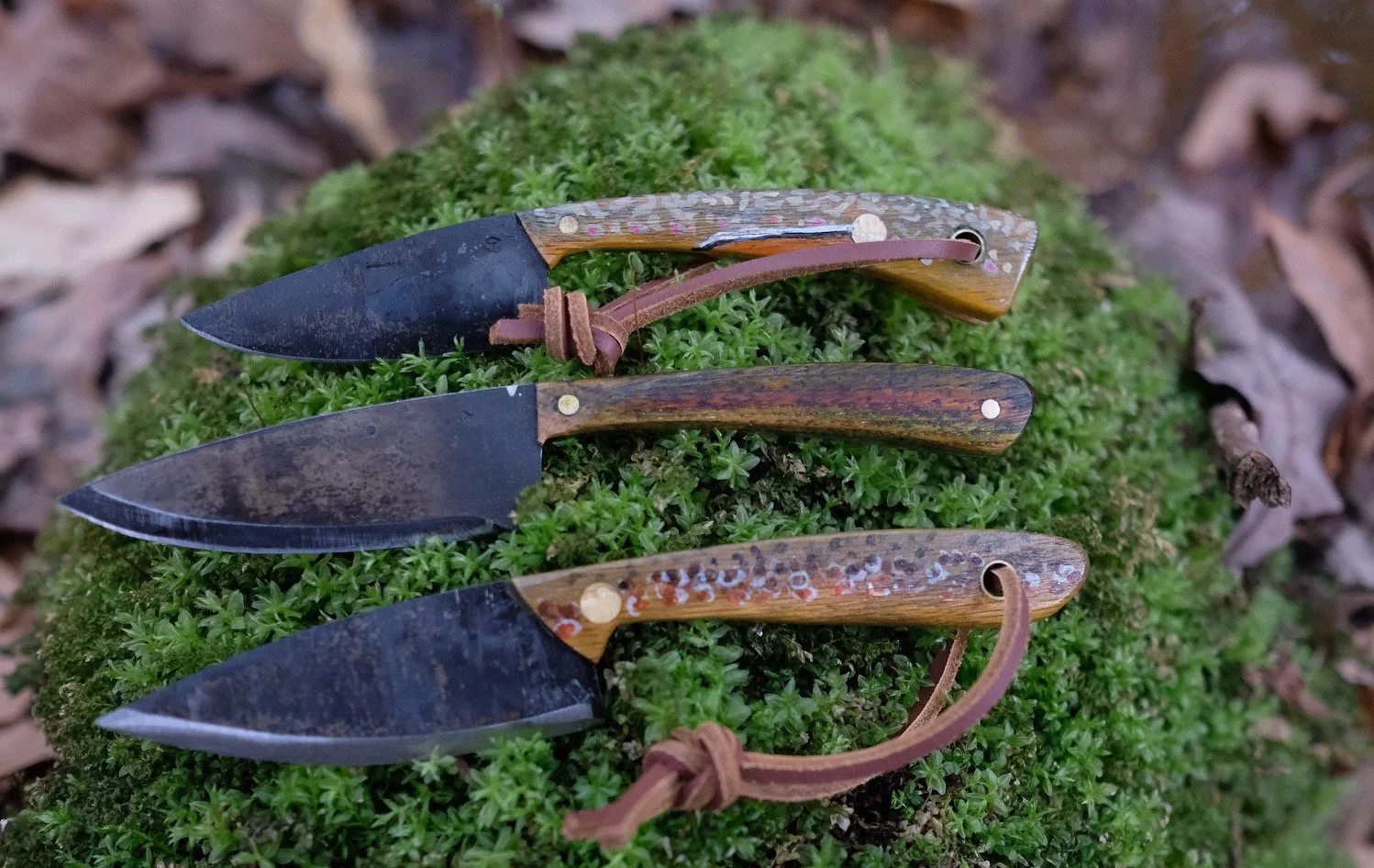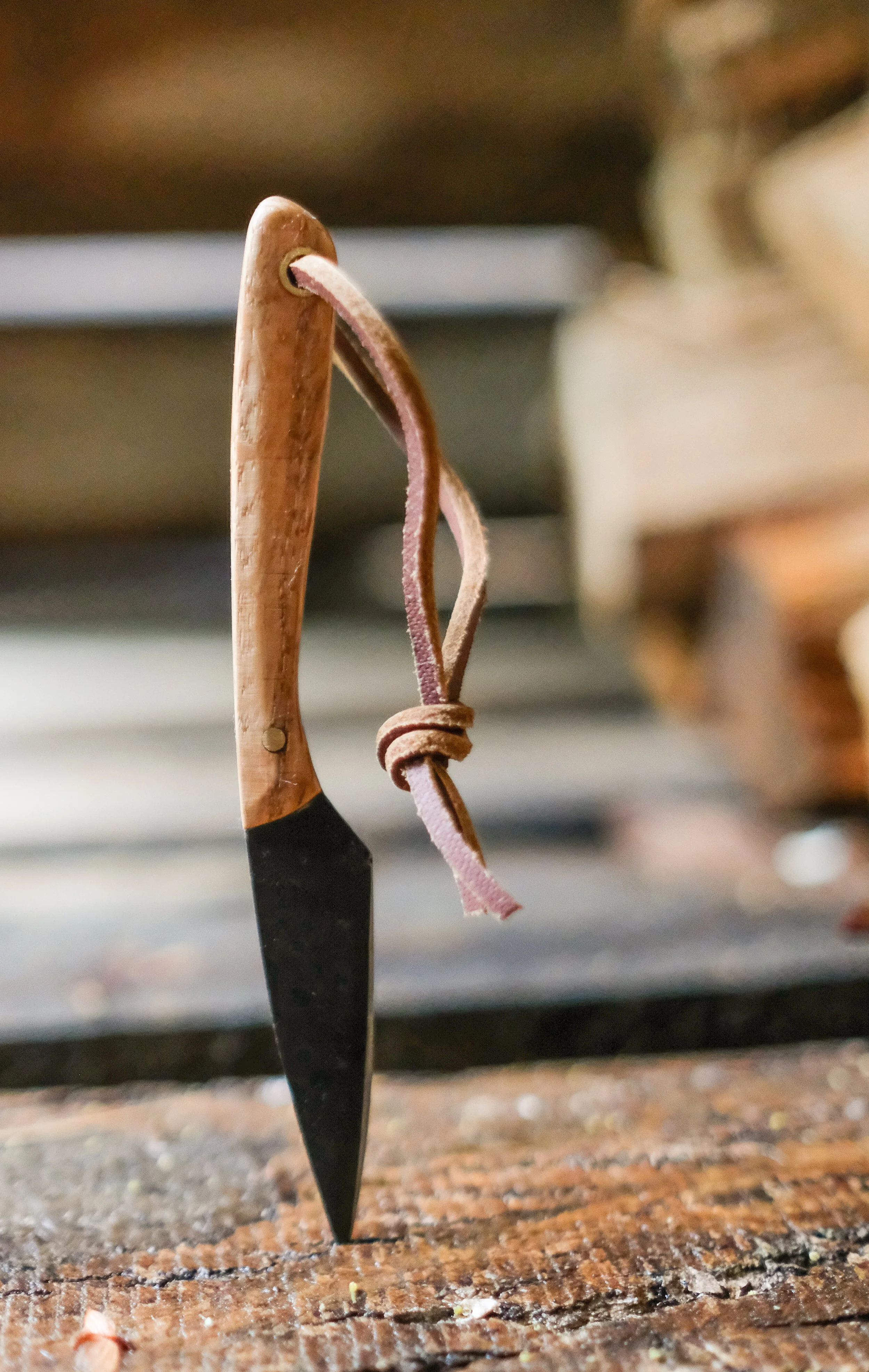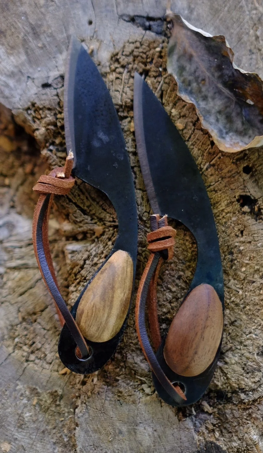 Rustic knives with native North American wood handles*. All knives are designed and cut from steel then drilled and forged to hardness. Wooden scales are shaped to fit each unique design, pinned, epoxied in place, and finished with several coats of Tung oil. Each knife comes with a novel sheath (see below). From kitchen utensils to a tool you can use in the field, these knives are created for purpose.