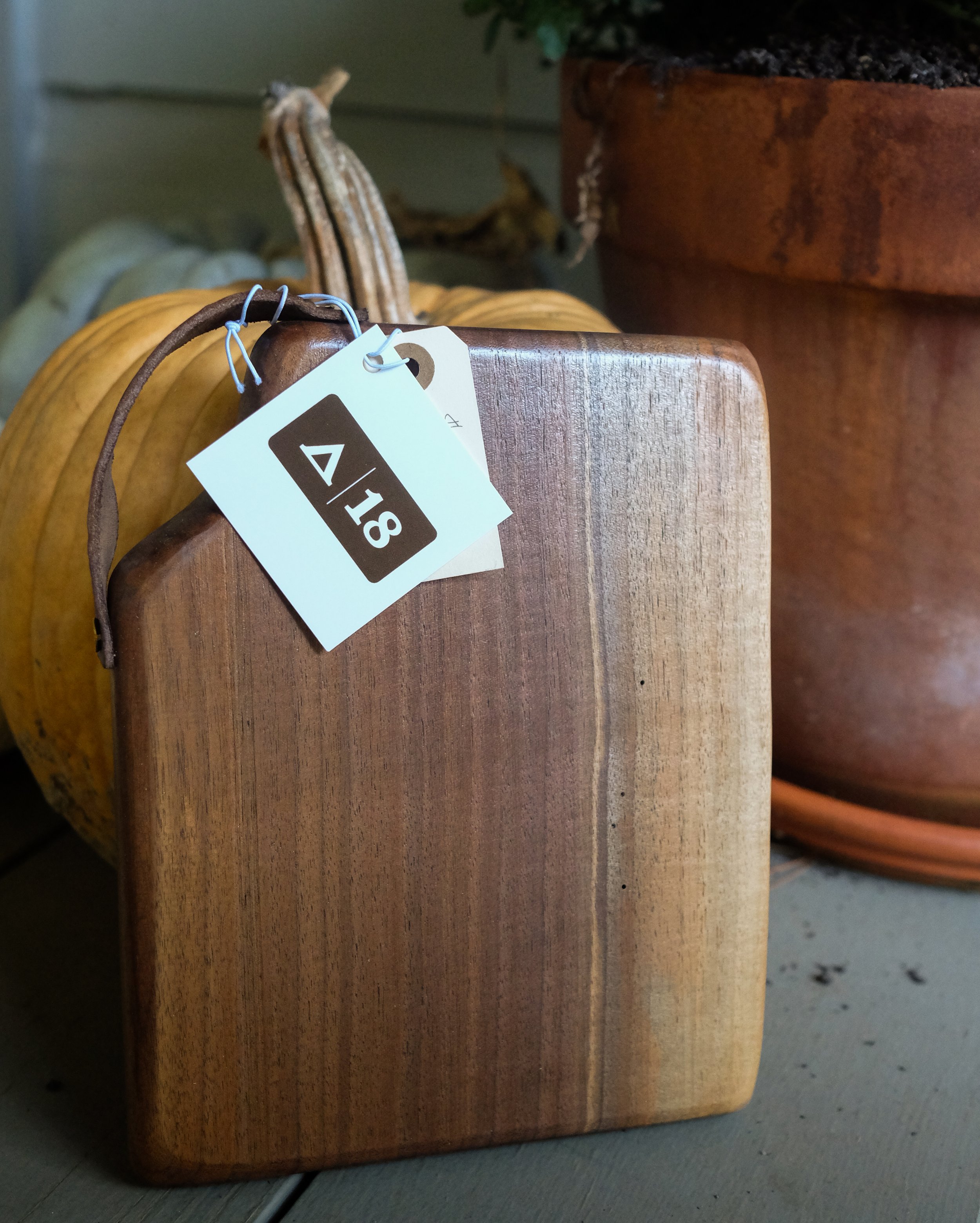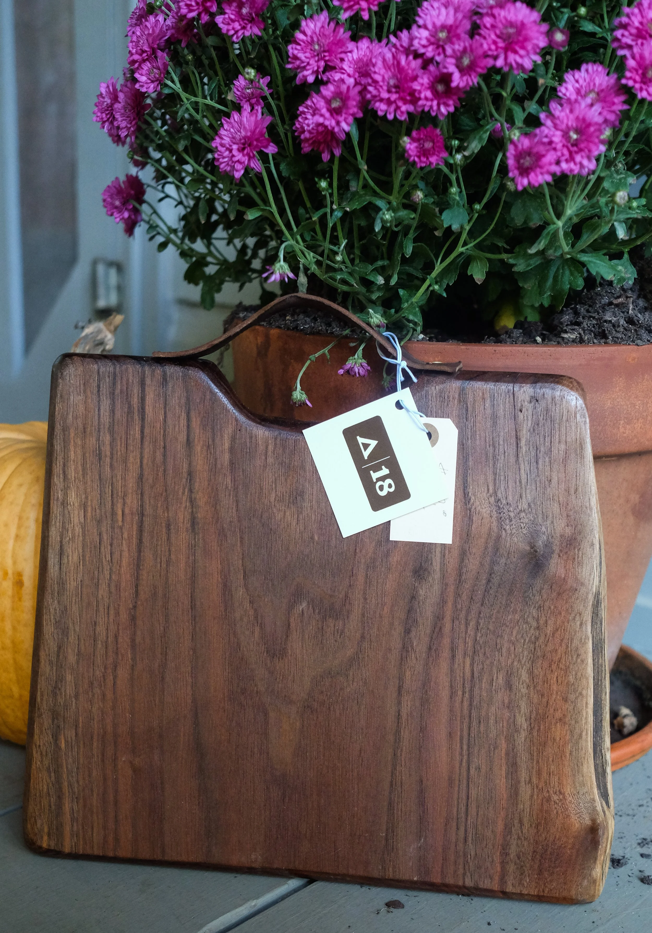Cutting/Charcuterie boards. Live edge native woods with a butcher block oiled finish and hand-dyed leather strap.